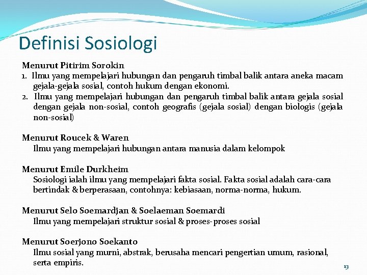 Sosiologi dapat dirumuskan sebagai: 1. Ilmu yang mempelajari struktur sosial. 2. Ilmu yang mempelajari proses sosial (pengaruh timbal balik antara pelbagai kehidupan bersama) 3. Ilmu yang mempelajari perubahan-perubahan sosial. • Struktur Sosial adalah keseluruhan jalinan antara unsur-unsur sosial yang pokok, yaitu kaidah-kaidah sosial (norma-norma sosial), lembaga-lembaga sosial, kelompok-kelompok sosial, serta lapisan-lapisan sosial. • Proses Sosial adalah pengaruh timbal balik antara pelbagai segi kehidupan bersama seperti antara segi kehidupan agama dan segi kehidupan politik, atau segi politik dengan segi ekonomi. • Perubahan Sosial adalah perubahan yang ada di dalam masyarakat yang bisa bersifat positif atau negatif, baik yang dikehendaki oleh manusia itu sendiri ataupun yang tidak dikehendakinya, dan dampak dari perubahan itu bisa luas bisa juga kecil jangkauannya. 12