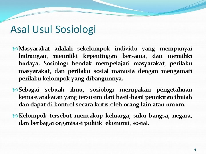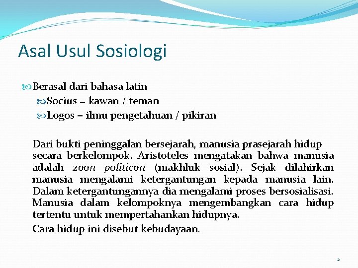Asal Usul Sosiologi Berasal dari bahasa latin Socius = kawan / teman Logos = ilmu pengetahuan / pikiran Dari bukti peninggalan bersejarah, manusia prasejarah hidup secara berkelompok. Aristoteles mengatakan bahwa manusia adalah zoon politicon (makhluk sosial). Sejak dilahirkan manusia mengalami ketergantungan kepada manusia lain. Dalam ketergantungannya dia mengalami proses bersosialisasi. Manusia dalam kelompoknya mengembangkan cara hidup tertentu untuk mempertahankan hidupnya. Cara hidup ini disebut kebudayaan. 2