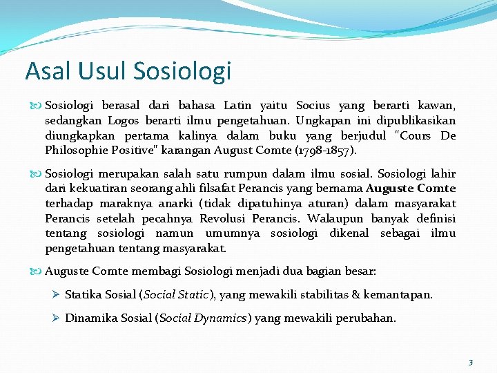 Asal Usul Sosiologi berasal dari bahasa Latin yaitu Socius yang berarti kawan, sedangkan Logos berarti ilmu pengetahuan. Ungkapan ini dipublikasikan diungkapkan pertama kalinya dalam buku yang berjudul "Cours De Philosophie Positive" karangan August Comte (1798 -1857). Sosiologi merupakan salah satu rumpun dalam ilmu sosial. Sosiologi lahir dari kekuatiran seorang ahli filsafat Perancis yang bernama Auguste Comte terhadap maraknya anarki (tidak dipatuhinya aturan) dalam masyarakat Perancis setelah pecahnya Revolusi Perancis. Walaupun banyak definisi tentang sosiologi namun umumnya sosiologi dikenal sebagai ilmu pengetahuan tentang masyarakat. Auguste Comte membagi Sosiologi menjadi dua bagian besar: Ø Statika Sosial (Social Static), yang mewakili stabilitas & kemantapan. Ø Dinamika Sosial (Social Dynamics) yang mewakili perubahan. 3