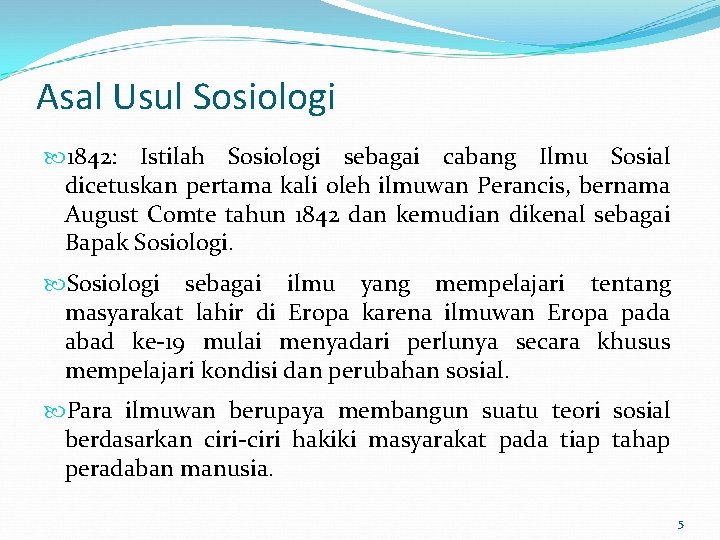 Asal Usul Sosiologi 1842: Istilah Sosiologi sebagai cabang Ilmu Sosial dicetuskan pertama kali oleh ilmuwan Perancis, bernama August Comte tahun 1842 dan kemudian dikenal sebagai Bapak Sosiologi sebagai ilmu yang mempelajari tentang masyarakat lahir di Eropa karena ilmuwan Eropa pada abad ke-19 mulai menyadari perlunya secara khusus mempelajari kondisi dan perubahan sosial. Para ilmuwan berupaya membangun suatu teori sosial berdasarkan ciri-ciri hakiki masyarakat pada tiap tahap peradaban manusia. 5