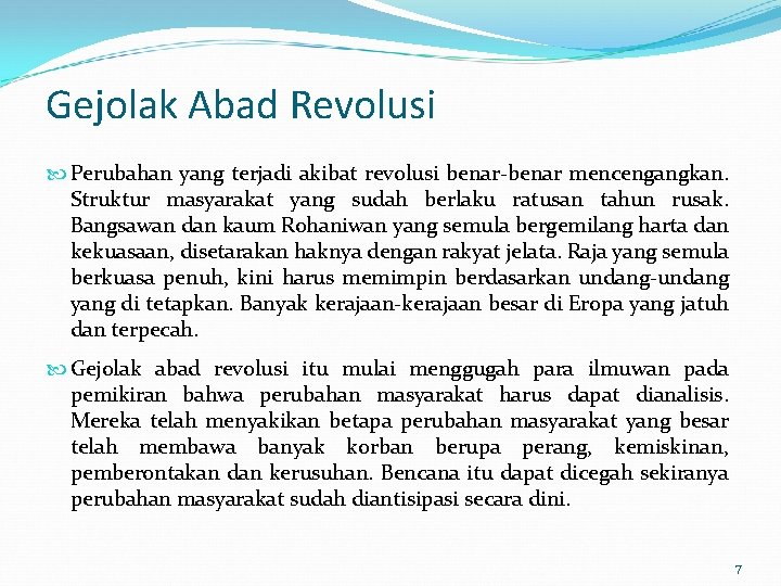 Gejolak Abad Revolusi Perubahan yang terjadi akibat revolusi benar-benar mencengangkan. Struktur masyarakat yang sudah berlaku ratusan tahun rusak. Bangsawan dan kaum Rohaniwan yang semula bergemilang harta dan kekuasaan, disetarakan haknya dengan rakyat jelata. Raja yang semula berkuasa penuh, kini harus memimpin berdasarkan undang-undang yang di tetapkan. Banyak kerajaan-kerajaan besar di Eropa yang jatuh dan terpecah. Gejolak abad revolusi itu mulai menggugah para ilmuwan pada pemikiran bahwa perubahan masyarakat harus dapat dianalisis. Mereka telah menyakikan betapa perubahan masyarakat yang besar telah membawa banyak korban berupa perang, kemiskinan, pemberontakan dan kerusuhan. Bencana itu dapat dicegah sekiranya perubahan masyarakat sudah diantisipasi secara dini. 7