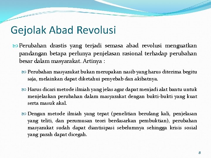 Gejolak Abad Revolusi Perubahan drastis yang terjadi semasa abad revolusi menguatkan pandangan betapa perlunya penjelasan rasional terhadap perubahan besar dalam masyarakat. Artinya : Perubahan masyarakat bukan merupakan nasib yang harus diterima begitu saja, melainkan dapat diketahui penyebab dan akibatnya. Harus dicari metode ilmiah yang jelas agar dapat menjadi alat bantu untuk menjelaskan perubahan dalam masyarakat dengan bukti-bukti yang kuat serta masuk akal. Dengan metode ilmiah yang tepat (penelitian berulang kali, penjelasan yang teliti, dan perumusan teori berdasarkan pembuktian), perubahan masyarakat sudah dapat diantisipasi sebelumnya sehingga krisis sosial yang parah dapat dicegah. 8