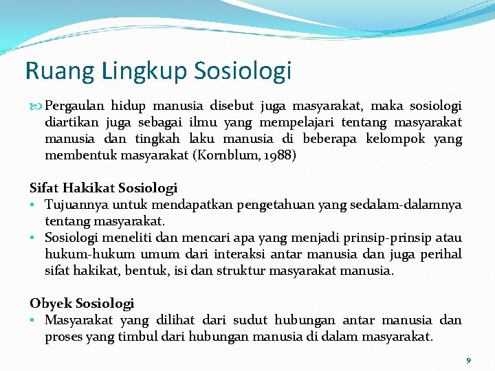 Ruang Lingkup Sosiologi Pergaulan hidup manusia disebut juga masyarakat, maka sosiologi diartikan juga sebagai ilmu yang mempelajari tentang masyarakat manusia dan tingkah laku manusia di beberapa kelompok yang membentuk masyarakat (Kornblum, 1988) Sifat Hakikat Sosiologi • Tujuannya untuk mendapatkan pengetahuan yang sedalam-dalamnya tentang masyarakat. • Sosiologi meneliti dan mencari apa yang menjadi prinsip-prinsip atau hukum-hukum umum dari interaksi antar manusia dan juga perihal sifat hakikat, bentuk, isi dan struktur masyarakat manusia. Obyek Sosiologi • Masyarakat yang dilihat dari sudut hubungan antar manusia dan proses yang timbul dari hubungan manusia di dalam masyarakat. 9