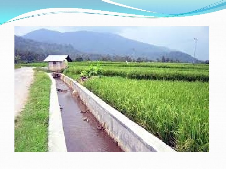 c. Irrigasi Tujuan: Peningkatan produksi pertanian, pengendalian salinitas. Struktur: Dam, reservoir, Sumur, Kanal, Pumps and pumping plant, weed-control, sistim distribusi, Farmland Grading 31