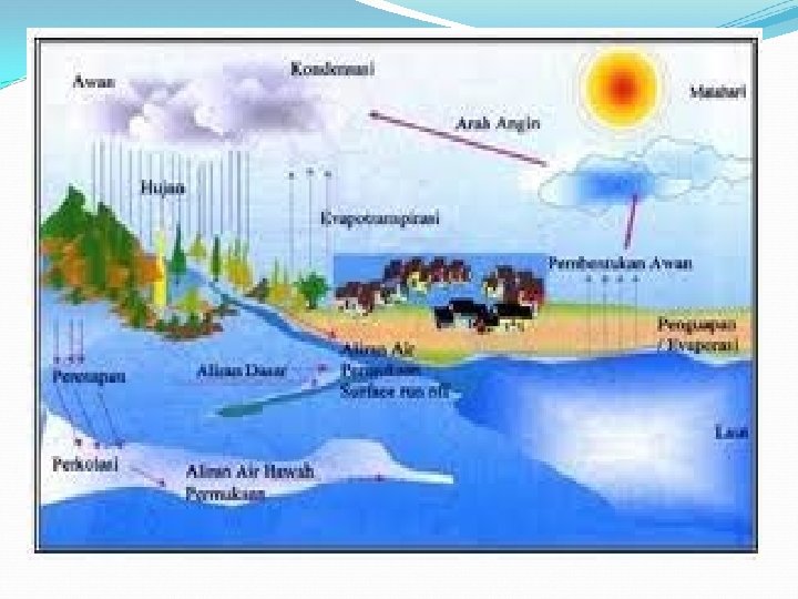SIKLUS HIDROLOGI Pergerakan air yang dialami oleh air yang terdiri dari berbagai peristiwa, yaitu : a. Penguapan (evaporasi) air yang terdapat di dalam dan atau keadaan berkeringat (transpirasi) b. Pembentukan awan (kondensasi) c. Peristiwa jatuhnya air ke bumi (presipitasi) d. Aliran air pada permukaan bumi dan di dalam tanah (perkolasi)