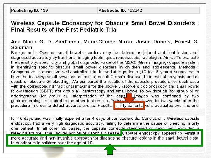 ü Paciente de 13 años de edad con anemia ferropénica, retraso estaturo-ponderal, diarrea, dolor abdominal y febrícula intermitentes, artralgias migratorias, elevación de VSG y orosomucoide. ü Gastroscopia, Ileo-Colonoscopia, serología celiaquía, TACabdominal y Tránsito intestinal normales. ü Juicio Capsuloendoscópico: Enf de Crohn ü Buena respuesta clínica y analítica tras tratamiento con 5 -ASA y Corticoides.