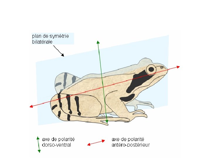 Les vertébrés présentent une organisation générale commune : leurs organes sont ordonnés selon 2 axes de polarité - axe antéro postérieur avec d'avant en arrière tète, tronc et queue - axe dorso ventral (opposant dos vers le haut et ventre vers le sol) ces 2 axes définissent un plan de symétrie. Imaginez une coupe passant par le plan de symétrie d'un vertébré