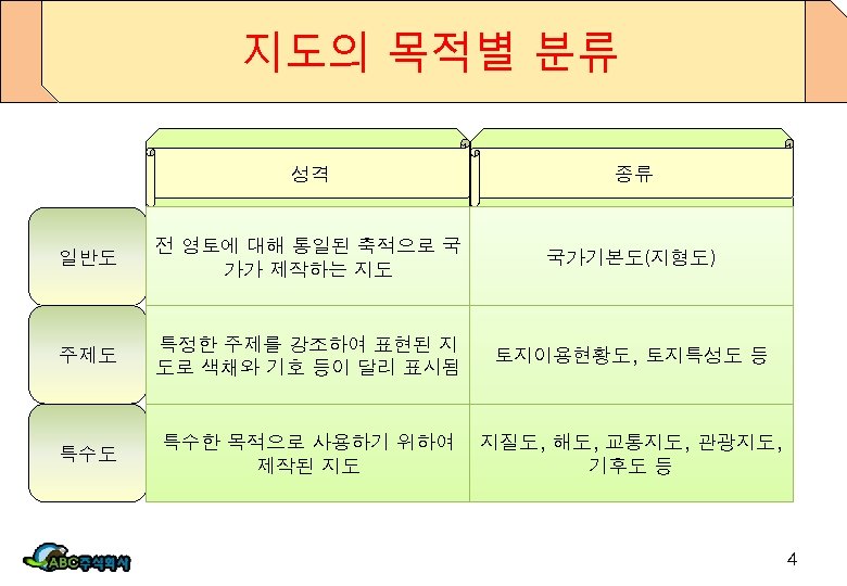 국토지리정보원 소개 v National Geographic Information Institute ü National Geographic Information Institute makes an provides the latest and accurate information to the public to realize “Digital Territory” in the Republic of Korea based on patriotic spirit on our land by producing. v 국토지리정보원 소개 ü 21세기 정보화 사회를 대비하여 보다 질 높은 국토지리 정보 제공 ü 국가기본도 및 기준점 성과의 데이터베이스 구축사업과 함께 GPS 상시 관측소 설치, 운영 3
