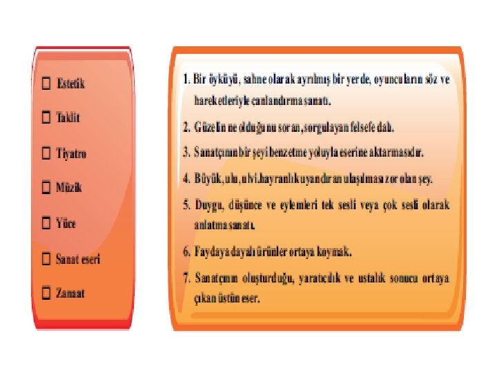 Kavramlar: Hoş, Suje, Obje, Yüce, Taklit, Sanat Eseri, Estetik haz , Güzellik ……………. . : Estetik bir öznenin; estetik bir tavırla, estetik bir nesneye yaklaşması sonucunda duyduğu estetik heyecan veya duygu. . . . . : Büyük, ulu, ulvi. Hayranlık uyandıran, ulaşılması zor olan şey. . . . . : İnsanın duygularını okşayan güzellik. Zevk veren, beğenilen. ……. . . . Varlığın onu algılayan kişi tarafından hoş, iyi olarak değerlendirilmesidir. Estetik tavır: Sanatla uğraşan, ondan anlayan kişinin sanat eserine karşı gösterdiği tavır veya tepki. . . : Sanatta konu olan nesne, varlık.