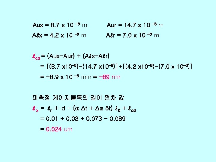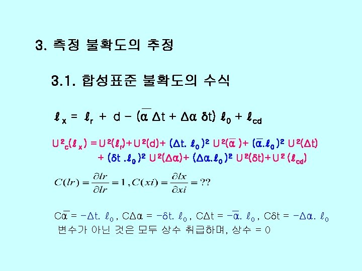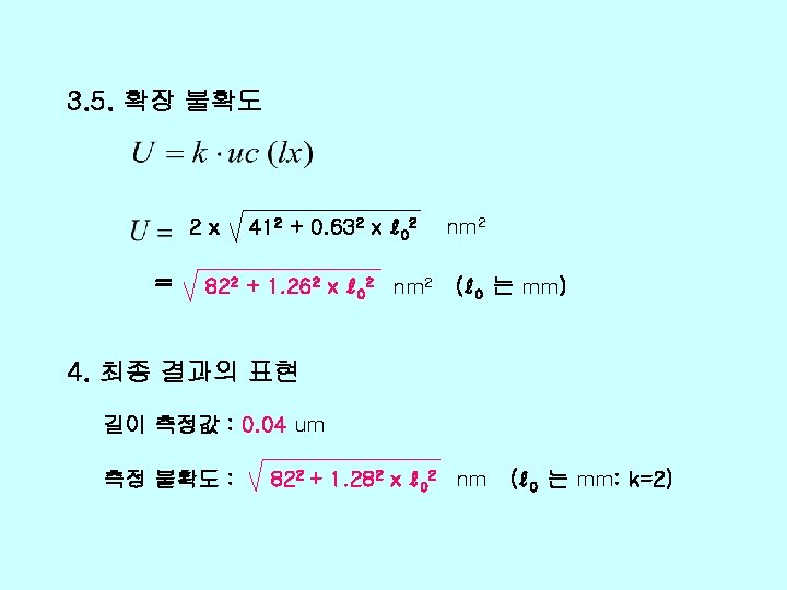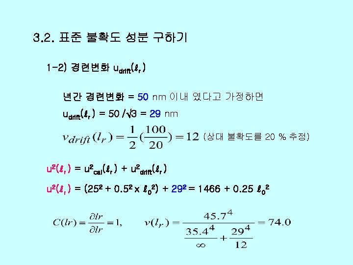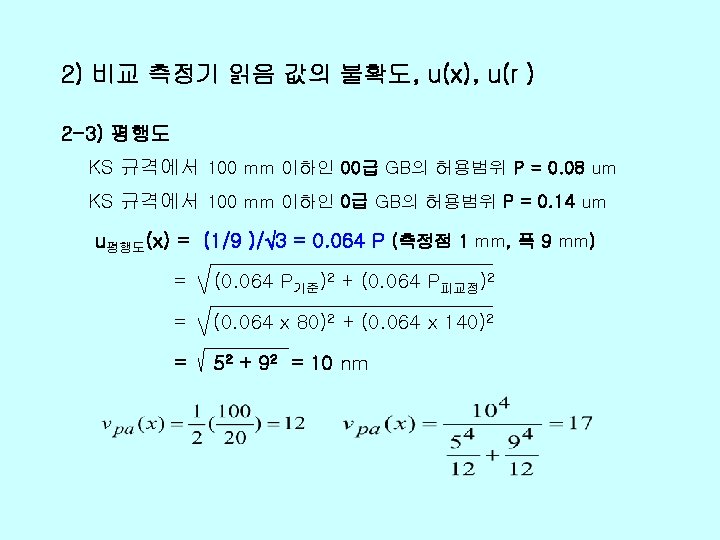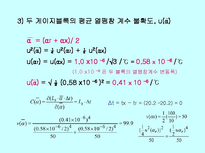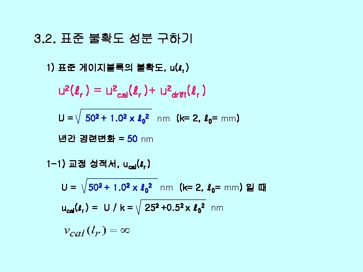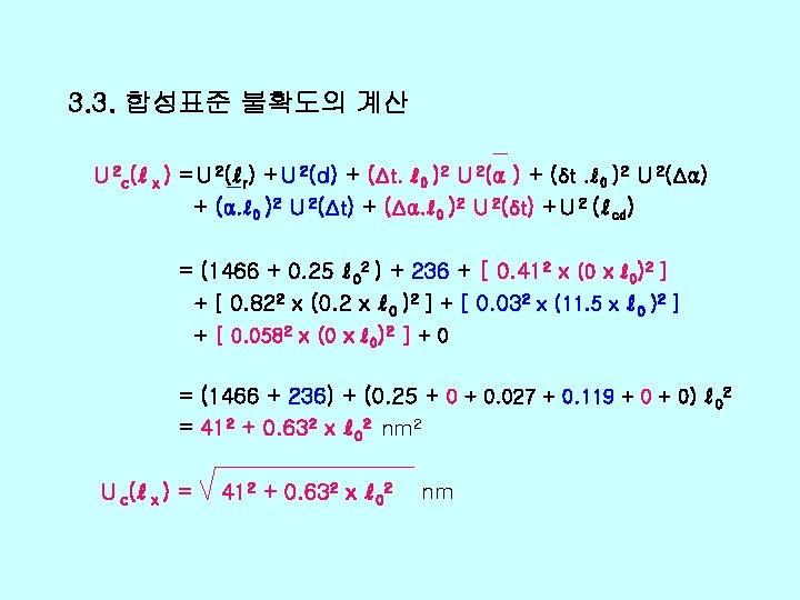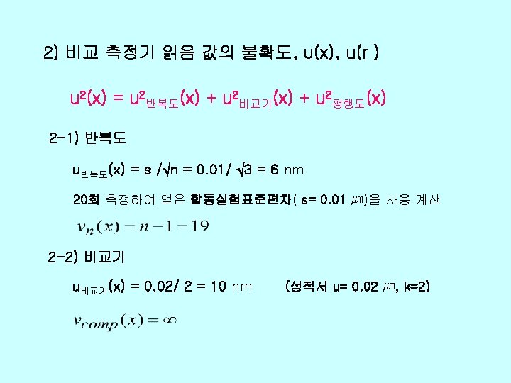 v Xi xi uxi ci uiy r 0 Slides: 26 Download presentation v 불확도 총괄표 양 Xi 추정값 xi 표준불확도 u(xi) 감도계수 ci 불확도 기 여도 ui(y) ℓr 0. 01 1466+0. 25 L 2 1. 0 d 0. 03 236 -1. 0 0 0. 412 0 0 99 Δα 0 0. 822 (0. 2 L)2 0. 027 L 2 99 Δt 0 0. 032 (11. 5 L)2 0. 119 L 2 12 δt 0 0. 0582 0 0 167 EX 0. 04 um 1466+0. 25 L 2 -236 √ 412+0. 632(L mm)2 자유도 v(xi) 74 90 102
