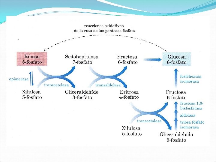 Conversión de pentosas fosfato a intermediarios de la glucólisis. Muchas células que llevan a cabo reacciones reductoras que tienen mayor necesidad por NADP que por ribosa 5 -fosfato. En estos casos, la transcetolasa y transaldolasa convierten la ribosa 5 -fosfato producida como producto final de la reacción oxidativa en gliceraldehído 3 -fosfato y fructosa 6 -fosfato, que son intermediarios de la glucólisis.