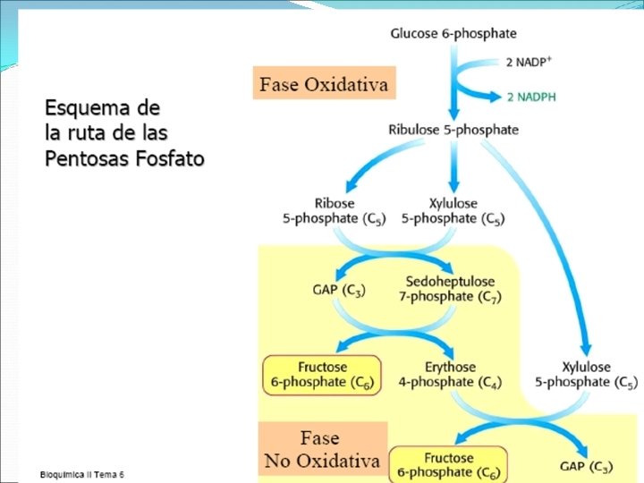 Se necesita más R 5 P que NADPH. Se puede sintetizar R 5 P sin producir NADPH si las reacciones primeras de la ruta de las pentosas fosfato no se producen. Las reacciones no oxidativas pueden proveer de ribosa 5 -fosfato a partir de fructosa-6 -fosfato en ausencia de los pasos oxidativos En este caso, es el F 6 P y la G 3 P, pero no el G 6 P, los que se utilizan (provenientes de la glicolisis), y mediante las enzimas transcetolasa y transaldolasa son convertidos en R 5 P.