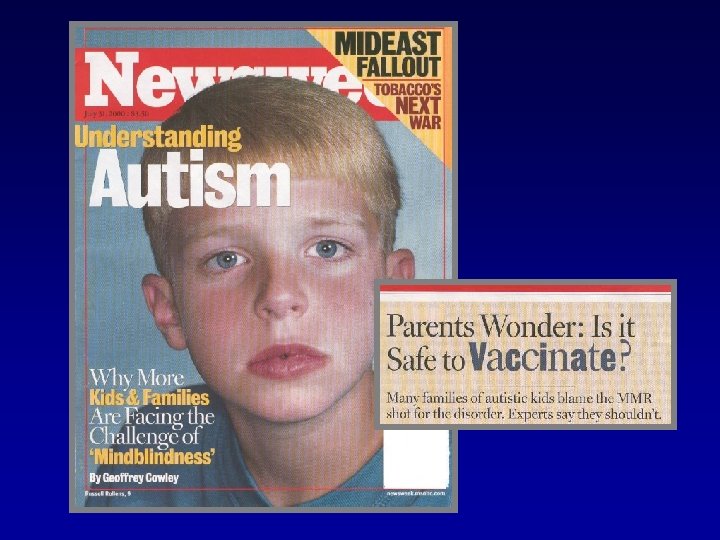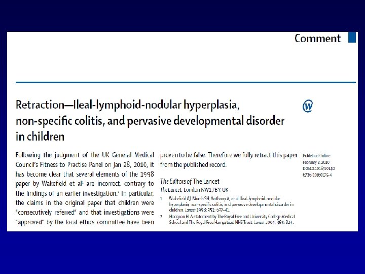 Wakefield …and the rest of the story § § § § Findings never reproduced Wakefield had serious financial conflicts Co-authors withdraw from paper Paper retracted from Lancet Hearings held by British Health Authorities Wakefield sanctioned and license revoked The details of ”an elaborate fraud” published in the British Medical Journal
