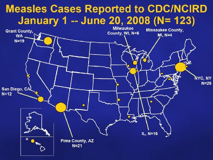 Other Measles Outbreaks in the U. S. -2008 § 131 cases from Jan-June 2008 (Average cases =63 annually 2000 -2007) § Washington outbreak (n=19) included 16 schoolaged children-all unimmunized § Illinois outbreak (n=30) included 25 school-aged children-all unimmunized § Altogether 91% of cases were unimmunized § 89% related to imported cases MMWR 2008; 57: 893