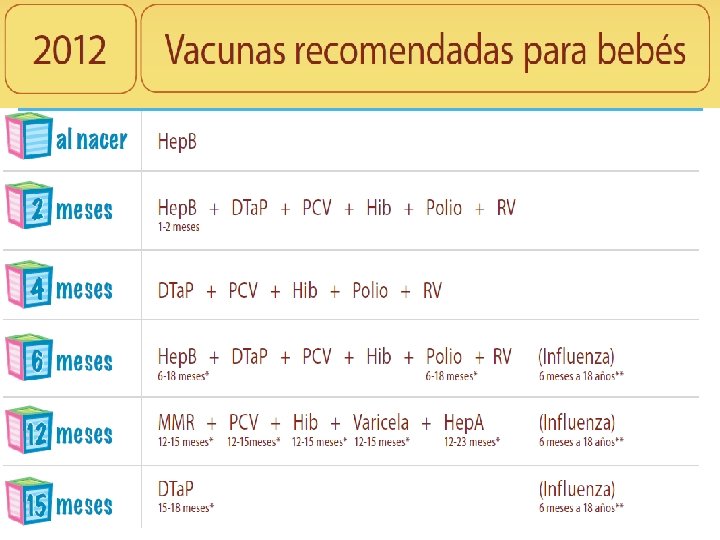 Cosas ya establecidas Dosificación Ni muchas ni pocas Edad Riesgo de enfermarse por edad Madurez del sistema inmune Capacidad para responder Interferencia por parte de los Anticuerpos maternos Intervalos Mínimo 4 semanas Antes de los 28 días, dosis inservible No existen intervalos máximos Se pueden múltiples vacunas