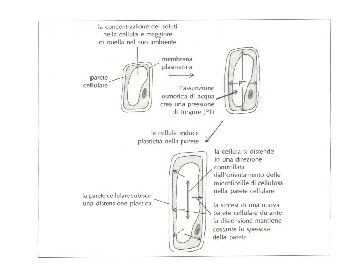 Se la parete non fosse in grado di opporsi al continuo richiamo d’acqua si avrebbe lo scoppio dei protoplasti e se il vacuolo perdesse acqua, determinando l’abbassamento della pressione di turgore, si avrebbe la PLASMOLISI cellulare. b) FORZA MOTRICE PER LA DISTENSIONE CELLULARE La pressione di turgore esercitata dal vacuolo in maniera uniforme sulla parete cellulare rappresenta la forza guida dell’accrescimento delle cellule vegetali