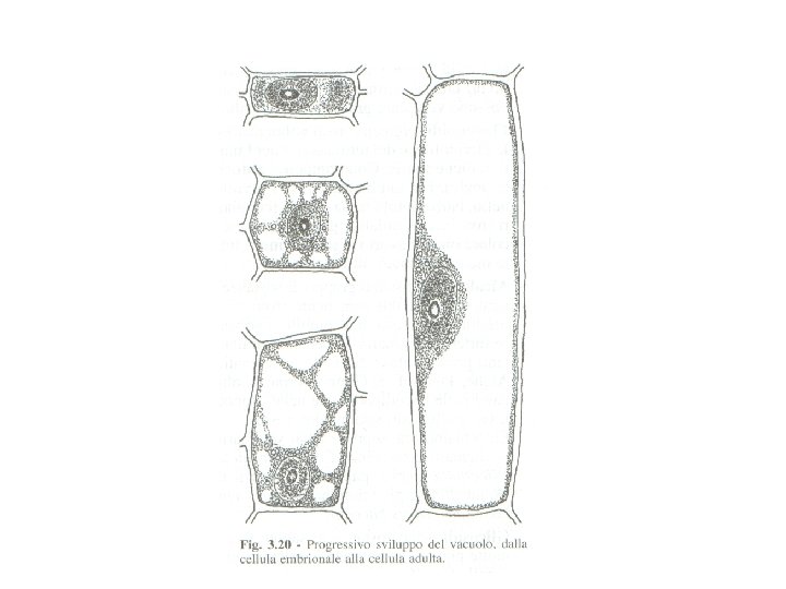 l’azione di enzimi idrolitici determina l’idrolisi sia del citoplasma che della membrana interna, si ha così la formazione di una struttura sferica (VACUOLO AUTOFAGICO) delimitata da una membrana detta tonoplasto (III) con il differenziamento cellulare, i piccoli vacuoli si ingrandiscono sia attraverso la fusione di vescicole prodotte dall’apparato del Golgi e del reticolo endoplasmatico, sia fondendosi tra loro per formare il grande vacuolo della cellula differenziata (IV, V)