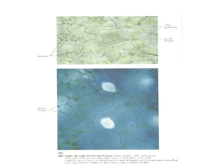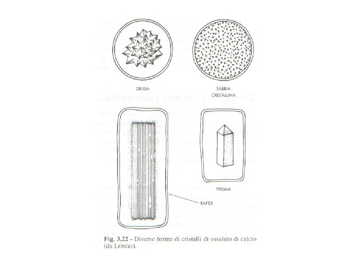 4) EQUILIBRIO e RISERVA DI IONI Nel vacuolo si accumulano molti ioni inorganici la cui natura e quantità è dovuta al tipo di terreno su cui cresce la pianta. Tutti gli ioni non immediatamente utilizzati vengono immagazzinati nel vacuolo mediante l’utilizzo di speciali proteine trasportatrici a livello del TONOPLASTO (TRASPORTO ATTIVO). Piante che vivono su terreni ricchi di elementi tossici tendono ad accumularli nel vacuolo. Gli ioni nel vacuolo possono rimanere sotto forma libera oppure formare dei sali e dei cristalli con gli acidi organici pure accumulati nel vacuolo (es. ossalato di Calcio: acido ossalico + Ca 2+). In particolare cristalli di ossalato di calcio formano degli inclusi solidi insolubili di varie forme (rafidi, prismi o stiloidi, druse, sabbia cristallina).