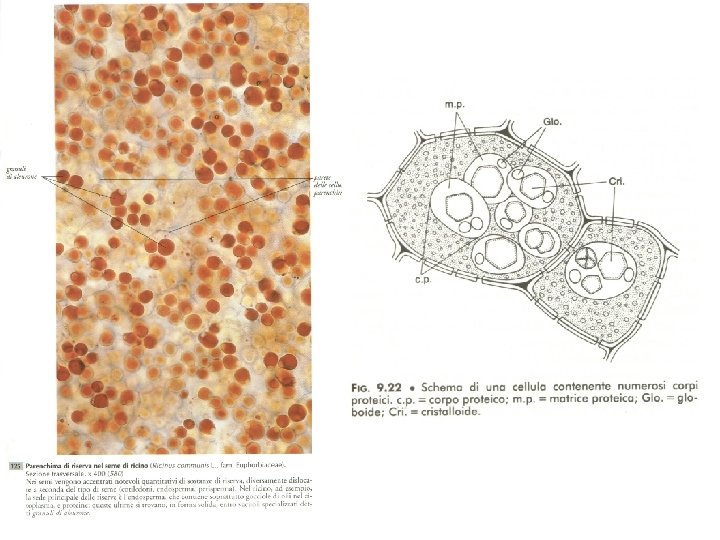 I granuli d’aleurone possono contenere, oltre alle sostanze proteiche, anche altre sostanze come ad es. la fitina. Possiedono una membrana che delimita una MATRICE PROTEICA (formata da albumine) che può includere un CRISTALLOIDE PROTEICO (formato da globuline), e corpi sferoidali di fitina (GLOBOIDI). Durante la germinazione le riserve vengono mobilizzate e i granuli aleuronici si dilatano per formare vacuoli pressoché normali.