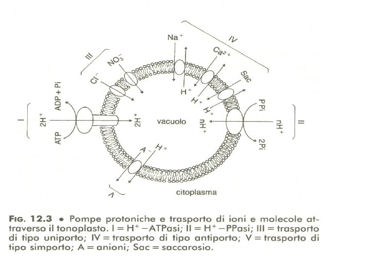 3) RUOLO TAMPONANTE del p. H citoplasmatico. Il succo vacuolare ha un p. H acido il cui valore in condizioni fisiologiche normali si aggira tra p. H 4 e 5. Questo valore è sempre notevolmente più basso rispetto a quello del citoplasma (p. H 6. 8 -6. 9). La capacità di mantenere il succo vacuolare ad un p. H acido è dovuto alla presenza sul tonoplasto di pompe protoniche (H+-ATPasi e H+-PPasi) che attraverso l’idrolisi dell’ATP e del pirofosfato inorganico forniscono protoni al succo vacuolare acidificandolo. La presenza di pompe protoniche sul tonoplasto è di notevole importanza fisiologica poiché alla loro funzionalità è strettamente legata la capacità di trasportare selettivamente ioni e metaboliti dal citoplasma al vacuolo e, in misura minima dal vacuolo al citoplasma, permettendo così il mantenimento del p. H costante del citoplasma.