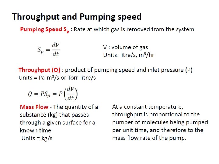 FLOW REGIMES Viscous Flow: Distance between molecules is small; collisions between molecules dominate; flow through momentum transfer; generally P greater than 0. 1 mbar Transition Flow: Region between viscous and molecular flow Molecular Flow: Distance between molecules is large; collisions between molecules and wall dominate; flow through random motion; generally P smaller than 10 mbar