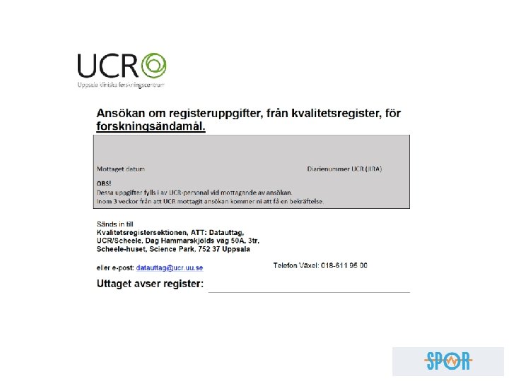 Vad gör jag om jag vill forska med SPORs data? �Lokala utvecklingsprojekt �Varje enhet har rätt att ta ut sin data för lokala förbättringsarbeten �UCR/SPOR behöver ingen ansökan! �Skicka info till SPOR koordinator �Upp till varje enhet att beakta PUL och PDL �Verksamhetsuppföljning – uppdrag från VC t. ex. �Fås som en Excelblad från UCR �Ej rensat dvs. du ansvarar för datakvalitén �Vänd dig till din lokal SPOR ansvarig