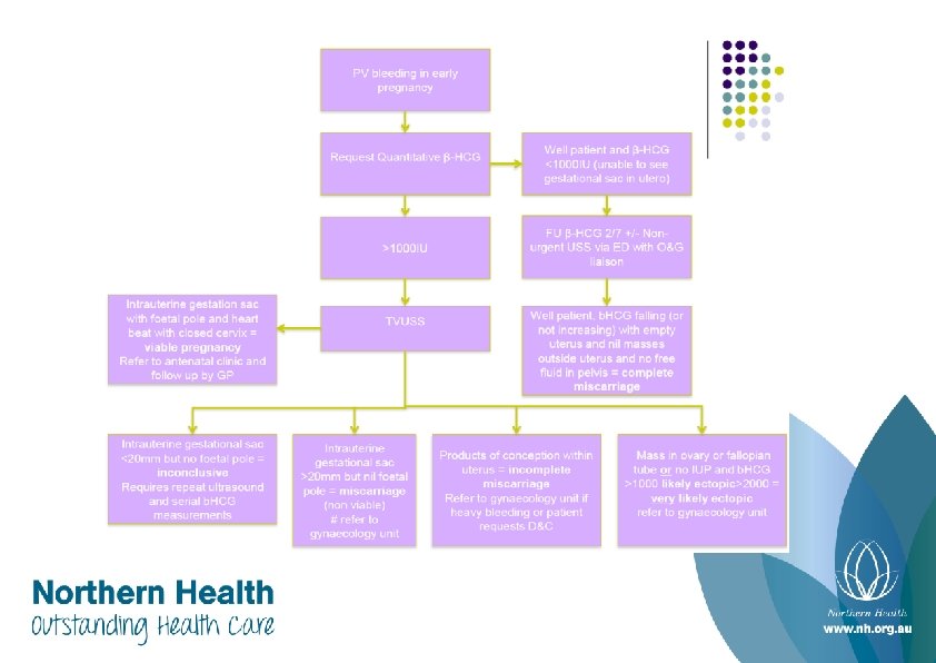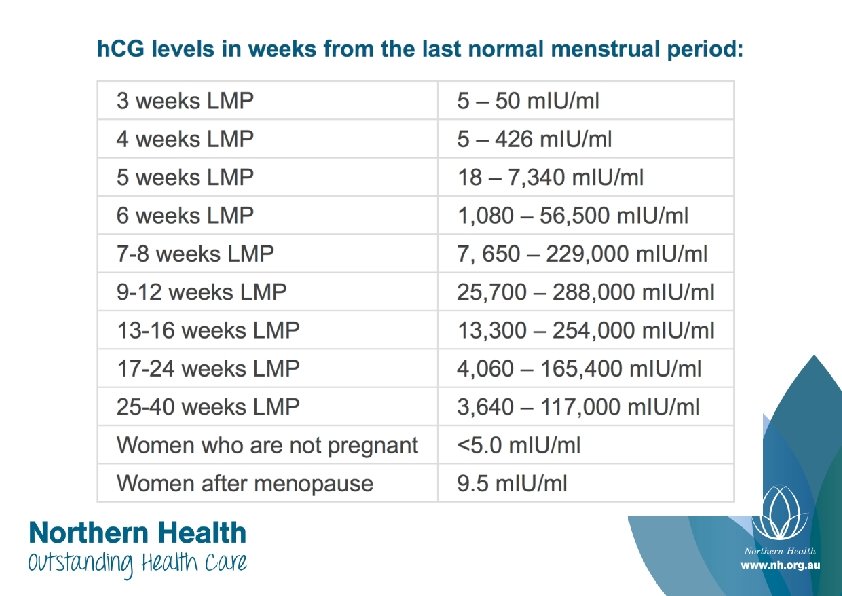 b. HCG • Threshold βHCG – level at which intrauterine gestational sac can be seen with TVUS • 1000 -2000 IU/L (6500 IU/L for TAUS) • β-HCG – First 60 days (weeks 4 -8) doubles every 1. 4 to 2. 1 days • Taking two β-HCG 48 hours apart can be helpful • <20% increase or a reduction it is 100% sensitive for foetal demise or ectopic • If β-HCG >50, 000 ectopic pregnancy very unlikely