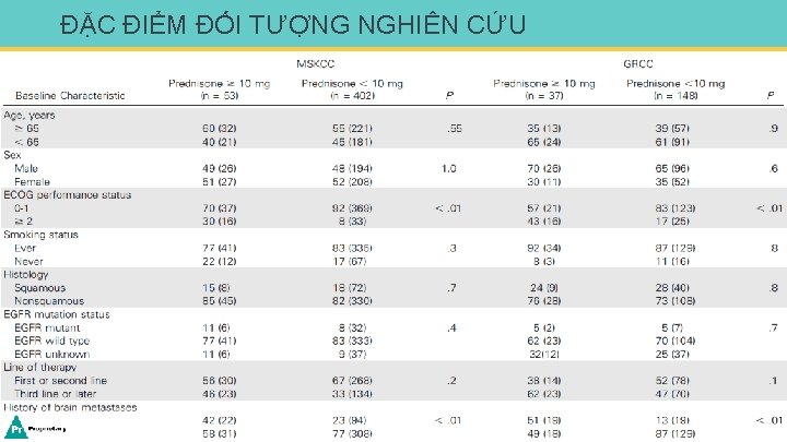 Phương pháp NC Memorial Sloan Kettering Cancer Center N=455 Gustave Roussy Cancer Center N=185 • NC hồi cứu • BN điều trị đơn trị với ức chế PD-1/PDL 1 • Đánh giá căn cứ trên báo cáo y khoa BN sử dụng >10 mg Steroid/ngày • • • ORR by Recist PFS OS từ khi bắt đầu điều trị Phân tích độc lập giữa 2 trung tâm • • • ORR by Recist PFS OS từ khi bắt đầu điều trị Published at jco. org on August 20, 2018.