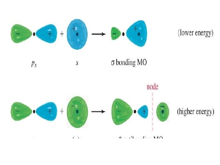Constructive and destructive overlap of 2 p orbitals to form and orbitals (a) Bonding orbital; (b) Antibonding orbital Overlap perpendicular to the internuclear axis is termed overlap. A nodal plane that contains the bond axis. The resulting orbitals are called and orbitals Remember: + and - refer to mathematical symbols, not charge
