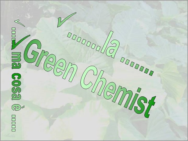 SFIDE PER UNO SVILUPPO SOSTENIBILE Ø SOCIETA’ SOSTENIBILE • Diversità, tolleranza, rispetto economico ed intellettuale Ø SOSTITUZIONE DEI COMBUSTIBILI PRODURRE ENERGIA • Sole, vento, idrogeno, biomasse…… FOSSILI PER Ø RICICLO DI PLASTICHE, METALLI ecc Ø PRODUZIONE DEI COMPOSTI A BASE DI CARBONIO DA FONTI RINNOVABILI • CO 2 • biomasse Ø PREVENZIONE INQUINAMENTO Ø GREEN CHEMISTRY / CHIMICA VERDE