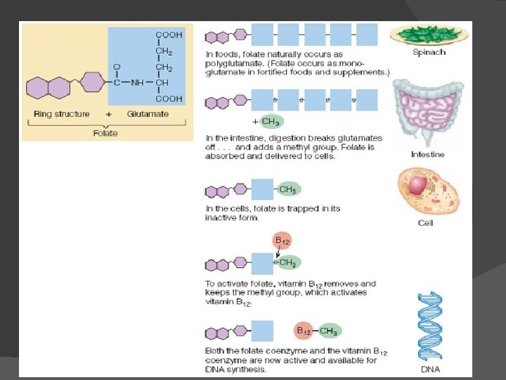 Vitamin B 12 and folate are closely related: each depends on the other for activation. (how does this activation work? ? Check out the next slide – follow the bouncing methyl group…) Main roles: helps maintain nerves and is a part of coenzymes needed in new blood cell synthesis.
