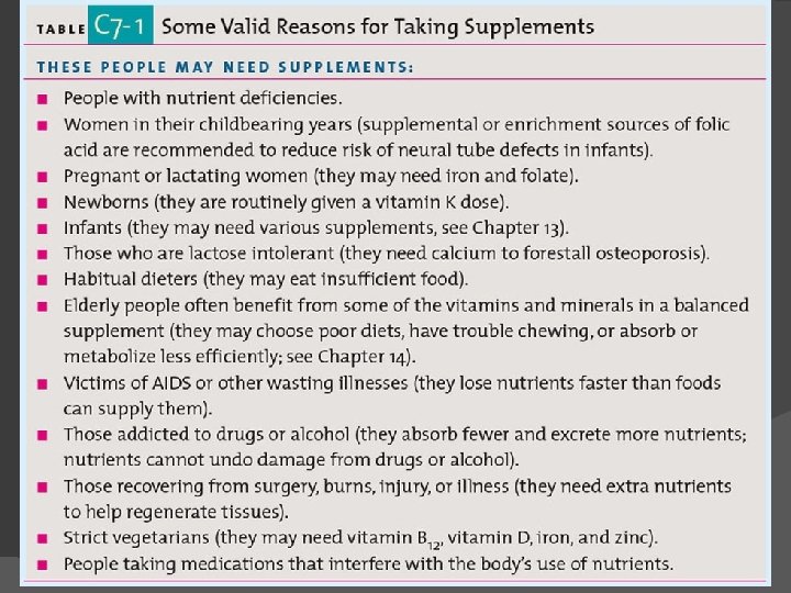 People with Increased Nutrient Needs Nutrient needs increase during certain stages of life and so sometimes nutrient supplementation is needed. 1. Women who lose a lot of blood and therefore a lot of iron during menstruation each month may need an _______ supplement. 2. Newborns require a single dose of vitamin ___ at birth. 3. Women of childbearing age need supplements of _______ to reduce the risk of neural tube defects.