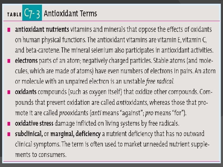 Marginal Deficiencies, Oxidative Stress, and Chronic Diseases Antioxidant nutrients help to quench free radicals, rendering them harmless to cellular structures. Population (epidemiological) studies support theory that people with high intakes of fruits and vegetables that supply the antioxidant nutrients enjoy better health than people with lower intakes.