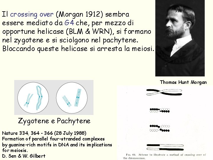 Il crossing over (Morgan 1912) sembra essere mediato da G 4 che, per mezzo di opportune helicase (BLM & WRN), si formano nel zygotene e si sciolgono nel pachytene. Bloccando queste helicase si arresta la meiosi. Thomas Hunt Morgan Zygotene e Pachytene Nature 334, 364 - 366 (28 July 1988) Formation of parallel four-stranded complexes by guanine-rich motifs in DNA and its implications for meiosis. D. Sen & W. Gilbert