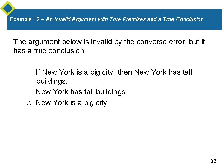 Example 12 – An Invalid Argument with True Premises and a True Conclusion The argument below is invalid by the converse error, but it has a true conclusion. If New York is a big city, then New York has tall buildings. New York has tall buildings. New York is a big city. 35