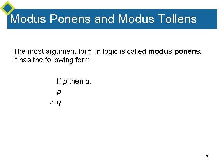Modus Ponens and Modus Tollens The most argument form in logic is called modus ponens. It has the following form: If p then q. p q 7