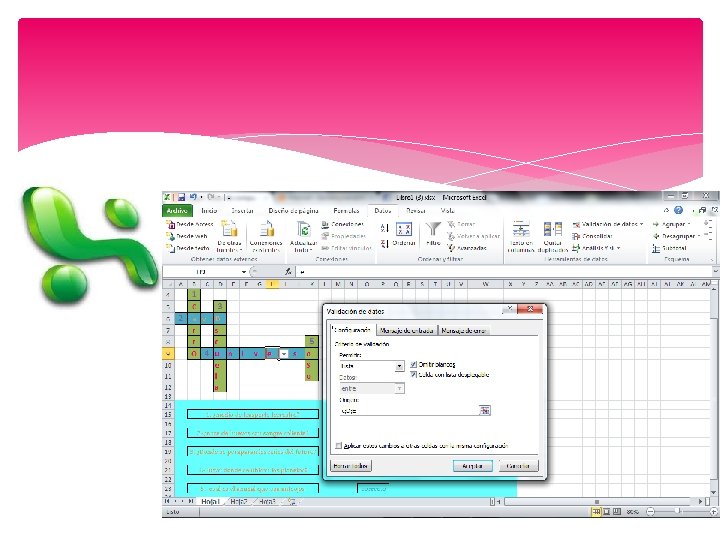 INTRODUCIR DATOS EN CELDAS VALIDADAS ESCRIBIR DATOS: CUANDO ESCRIBES DATOS EL MENSAJE ENTRANTE PERMANECE EN LA PANTALLA ( LA LISTA DESPLEGABLE PUEDE TAPAR PART DEL MENSAJE). ESCRIBIR DATOS VALIDOS: SI ESCRIBES DATOS VALIDOS Y PRESIONAS ENTER LOS DATOS QUEDAN INTRODUCIDOS Y NO SUCEDE NADA ESPECIAL. ESCRIBIR DATOS NO VALIDOS: SI ESCIBES DATOS QUE NO CUMPLEN LOS CRITERIOS Y SE ESPECIFICO UN MENSJE DE ERROR PARA LOS DATOS NO VALIDOS, DICHO MENAJE APARECERAN UN GLOBO DE AYUDANTE.