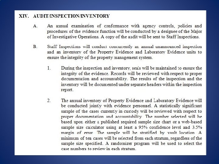 2. Determine what your “strata” are (that’s the places where you’ve got stuffed) Bet you’re asking why? Well, this will allow you the broadest sample and to meet the “extra security measures” element of the standards. The basic places are usually: - General property - Evidence - Narcotics - Firearms/weapons - High-value (money/jewelry/negotiable instruments) 3. Determine the population of stuff in each strata.
