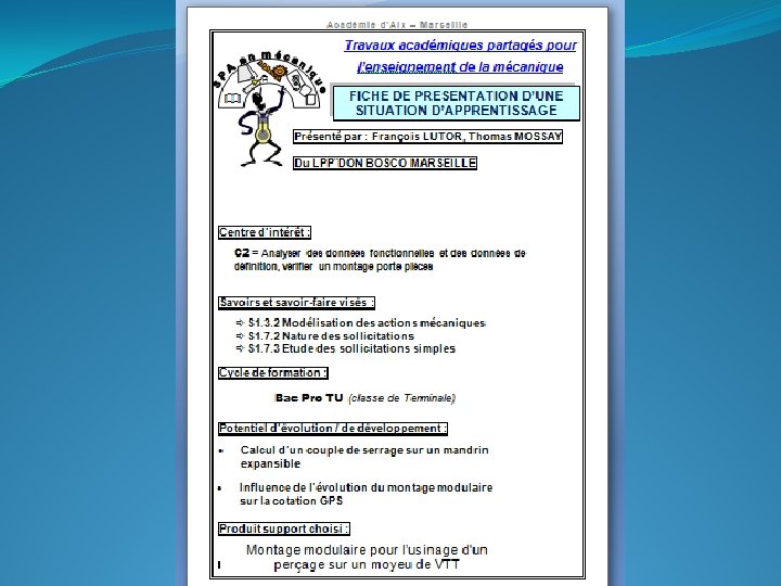 Validation d’un Montage Modulaire pour l’usinage d’un moyeu de VTT en Phase de Perçage Pour cette étude , l’élève sera guidé à travers les étapes suivantes ANALYSE DU MONTAGE MODULAIRE ( PORTE PIECES) Position isostatique du moyeu (MIP) Maintien en position du moyeu (MAP) CALCULER LES EFFORTS DE COUPE DU FORET Calcul de l’effort de poussée du foret Calcul du couple de perçage DEFINIR LES CARACTERISTIQUES MATIERES DU MOYEU Alliage d’aluminium 2018 MODELISATION DU COMPORTEMENT DU MOYEU
