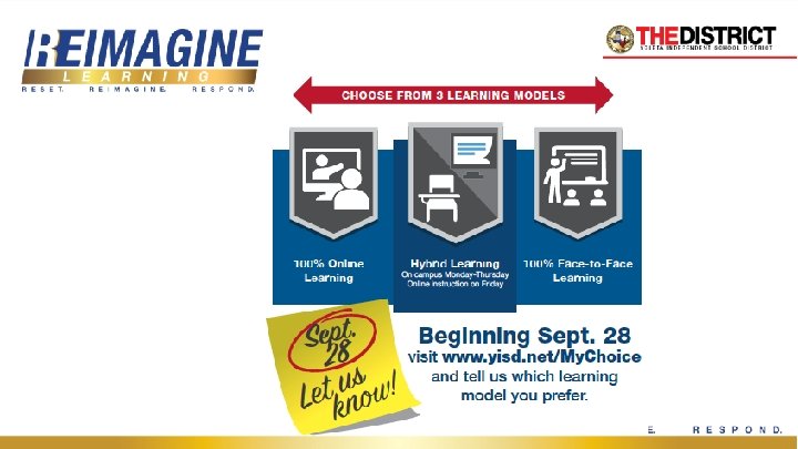 Choice To Learn All families are asked to complete the Choice to Learn Survey to indicate whether you would like your child to return to campus for face to face instruction or choose to remain online for virtual instruction: www. yisd. net/mychoice If you choose to return, VVECHS will begin face to face instruction on Oct. 19 th. Keep in mind that VVECHS does NOT have intersession so classes will continue online during the week of Oct. 12 th. If you choose to remain online, instruction will continue in the same format of the past eight weeks.