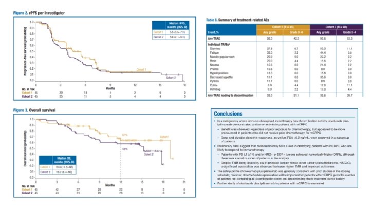 • • N= 17 Eligible patients had received prior enzalutamide and/or abiraterone. Patients received durvalumab 1500 mg i. v. every 28 days and olaparib 300 mg tablets p. o. every 12 h until disease progression or unacceptable toxicity. All patients had biopsies of metastatic lesions with an evaluation for both germline and somatic mutations. The most common treatment-related grade 3 or 4 adverse events were • anemia (4/17; 24%), • lymphopenia (2/ 17; 12%), • infection (2/17; 12%), • nausea (2/17; 12%) Karzai et al, Journal Immunot Cancer 2018
