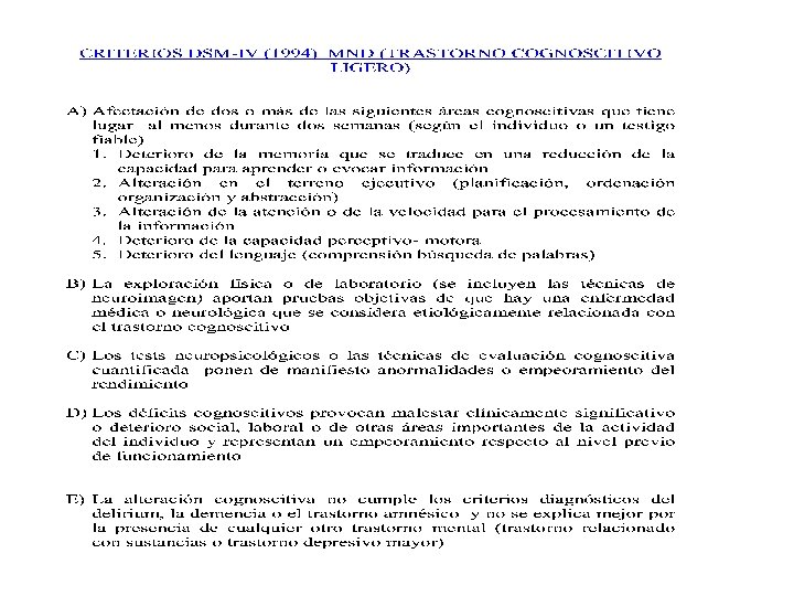 Criterios de deterioro cognoscitivo Peterson y cols 1997 • Quejas de pérdida de memoria corroboradas por un informador fiable • Función cognoscitiva general normal • No existe alteración significativa de las AVD • Afectación de la memoria demostrada por menor rendimiento en test psicometricos – Wesler, test de aprendizaje verbal auditivo, lista de palabras CERAD • No existe demencia ni E A: según criterios DSMIV y NINCDS-ADRDA