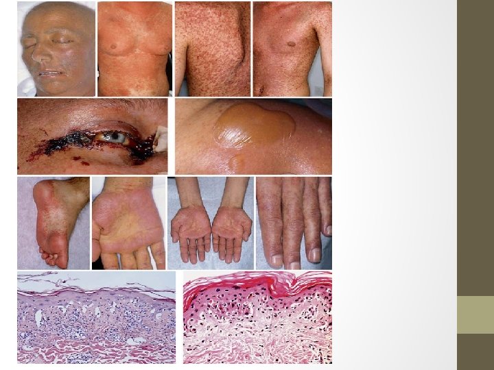 PIEL Órgano afecto más frecuentemente Epidermis: liquen plano, queratosis Dermis: esclerosis móvil, superficial Tejido subcutáneo: esclerosis fija ( profunda) , rigidez cutánea, compromiso de fascias Pérdida de epidermis: úlceras Apuntar el tipo de lesión