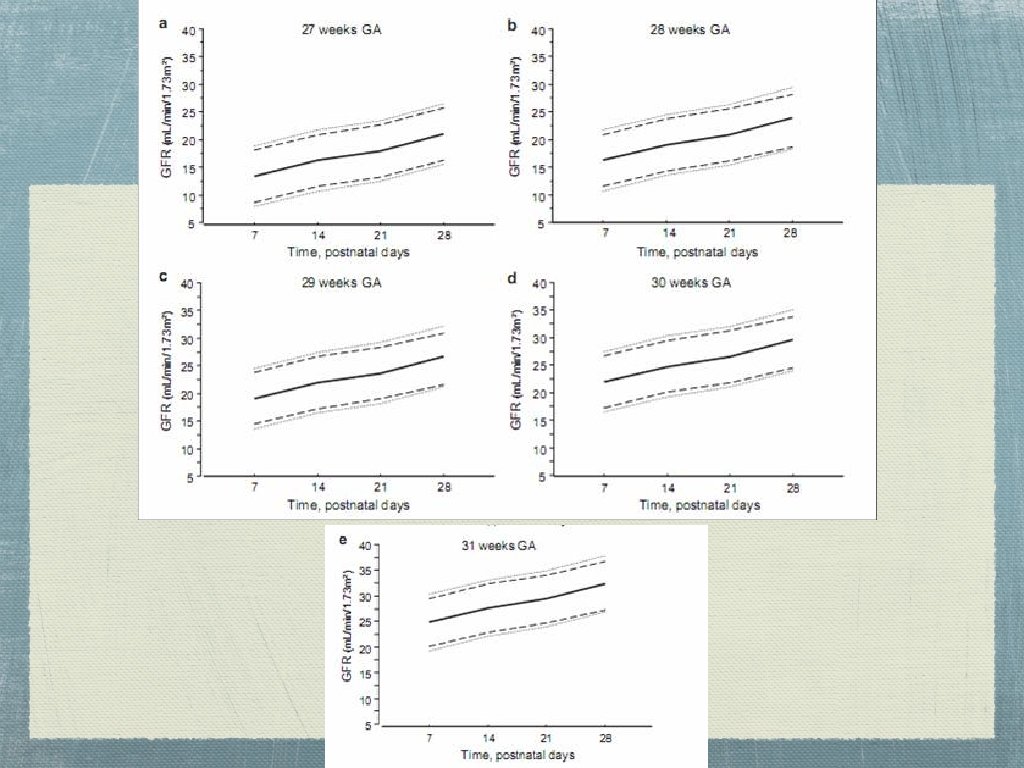 Introdução É importante estabelecer valores de referência para a taxa de filtração glomerular em prematuros. Estes valores podem ajudar a classificar prematuros em grupos de risco, permitindo aos médicos adaptar doses de drogas para a depuração renal, reduzindo efeitos colaterais renais. Estudos anteriores sobre a função renal em prematuros ou foram com base em um número reduzido de crianças ou a taxa de filtração glomerular (TFG) simplesmente apresentou valores como a média e SD ou SEM.