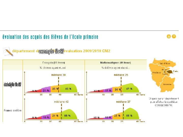 A quoi vont servir les résultats ? Pour les inspecteurs de circonscription, les directeurs, les maîtres, chacun à son niveau Analyser finement les résultats et repérer les difficultés isolées ou massives. Repérer les marges de progrès et fixer des cibles locales en cohérence avec les cibles départementales, académiques, nationales. Mobiliser les équipes. Définir ou adapter les plans d’animation et de formation. Adapter les dispositifs d’aide et de soutien.