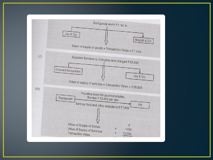 q Cost of Accounting = Is the cost incurred by the person for bringing the products in the condition in which they are sold. It include : -Cost of material - Duties and taxes - Transport Cost - Insurance - Other Expenses q Trade Discounts , rebate and other discounts shall be deducted. q Recipient shall be allowed ITC of CGST, SGST, IGST and UTGST.