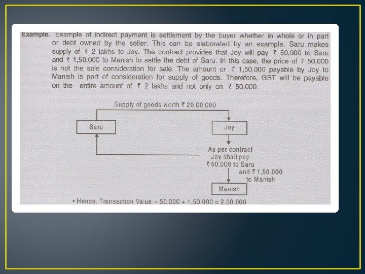 Determination of transaction value It us the value of supply of goods , services or both. It is the price paid or actually payable. There must be a nexus between amount received or supply made. Nature of supply must be ascertained. Price must be the sole consideration. Supplier and recipient must not be related. Inclusions in the transaction value Value does not include GST but all other taxes: Any taxes , duties levied under any other act other than CGST or SGST act or UT GST act will bee includable.