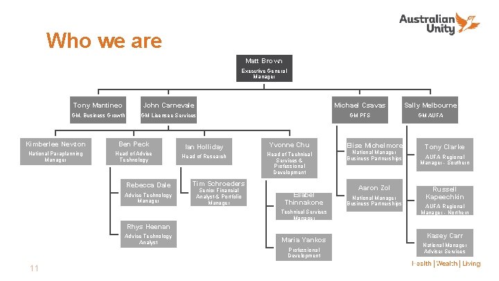 Practice/Adviser Executive GM GM – AUFA, PFS, Licensee Services, Business Growth National Managers, Business Partnerships -PFS Northern/Southern Regional Managers -AUFA Support Network Marketing 10 Brokerage Adviser Services Adviser Development Research Business Development Xplan / Commpay Paraplanning Auditors Finance Tech Support Advice Assurance & Quality Professional Development events