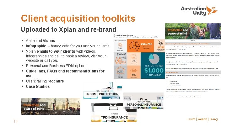 Practice development Achieving practice success § § § Practice success = # of Clients x Productivity Appropriate risk 13 The right number of the right clients. Ability to service productively your clients. Underpinned with appropriate Risk Management mechanisms. How can we assist and add value to your Practice Success: § Comprehensive approach addressing business coaching, business planning, COIs, soft skills, operational efficiencies, productivity and technology § National Managers have complementary skills and are specialists (vast experience in practice management, such as, business coaching, business planning, client acquisitions, implementation in operational and productive efficiencies via technology § Project management/implementation assistance to drive outcomes