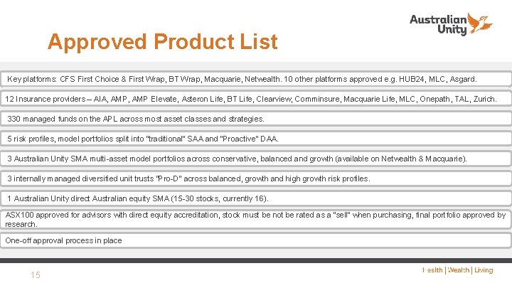 Approved Product List Key platforms: CFS First Choice & First Wrap, BT Wrap, Macquarie, Netwealth. 10 other platforms approved e. g. HUB 24, MLC, Asgard. 12 Insurance providers – AIA, AMP Elevate, Asteron Life, BT Life, Clearview, Comminsure, Macquarie Life, MLC, Onepath, TAL, Zurich. 330 managed funds on the APL across most asset classes and strategies. 5 risk profiles, model portfolios split into “traditional” SAA and “Proactive” DAA. 3 Australian Unity SMA multi-asset model portfolios across conservative, balanced and growth (available on Netwealth & Macquarie). 3 internally managed diversified unit trusts “Pro-D” across balanced, growth and high growth risk profiles. 1 Australian Unity direct Australian equity SMA (15 -30 stocks, currently 16). ASX 100 approved for advisors with direct equity accreditation, stock must be not be rated as a “sell” when purchasing, final portfolio approved by research. One-off approval process in place 15